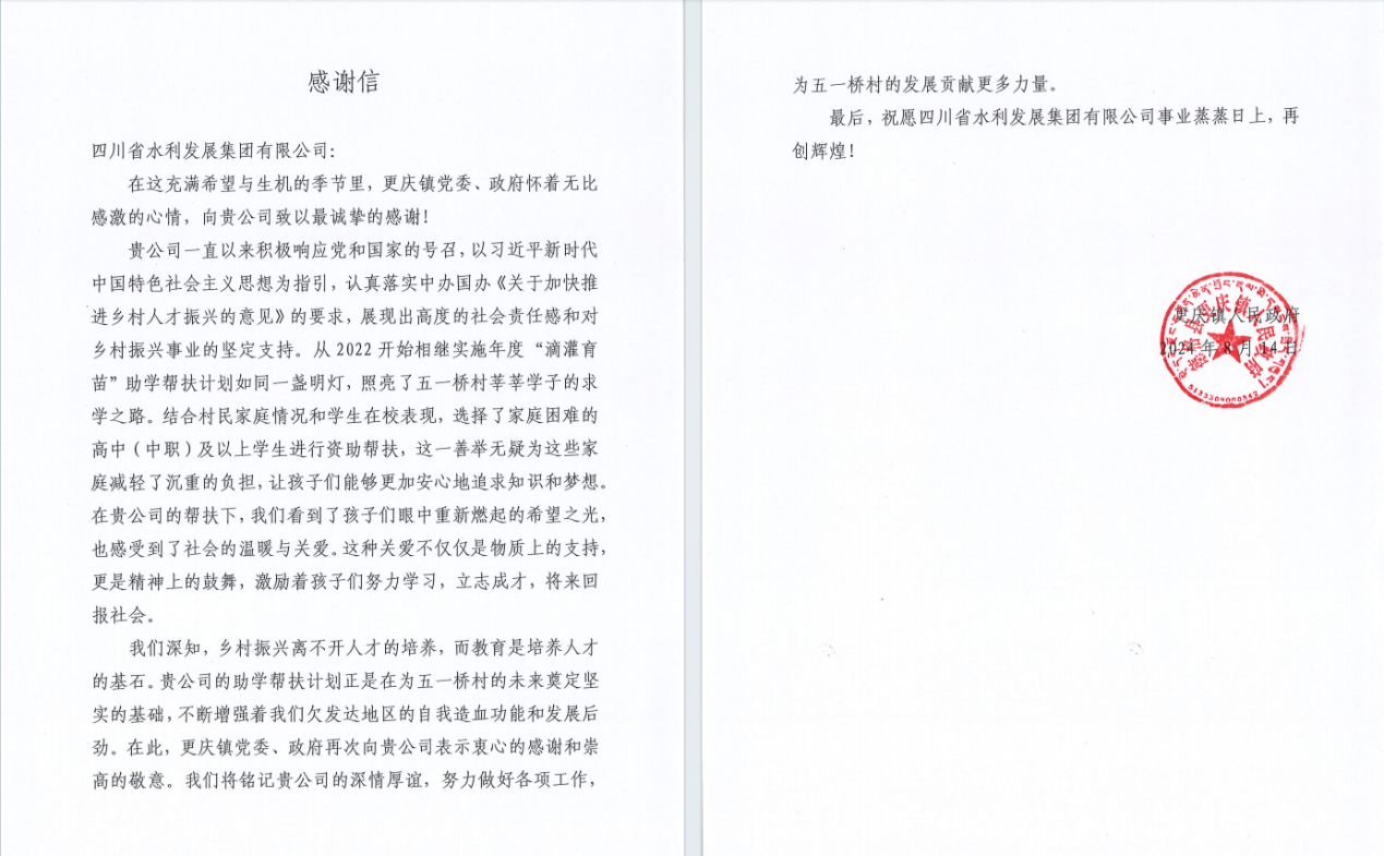 “在貴公司的幫扶下,我們看到了孩子們眼中重新燃起 的希望之光,也感受到了社會的溫暖與關(guān)愛?!苯眨瘓F(tuán)收到了來自托底幫扶德格縣所屬更慶鎮(zhèn)人民政府的一封感謝信,信中更慶鎮(zhèn)黨委政府提到集團(tuán)實(shí)施的“滴灌育苗”助學(xué)幫扶計(jì)劃如同一盞明燈,照亮了五一橋村莘莘學(xué)子的求學(xué)之路,增強(qiáng)了五一橋村的自我造血功能和發(fā)展后勁。